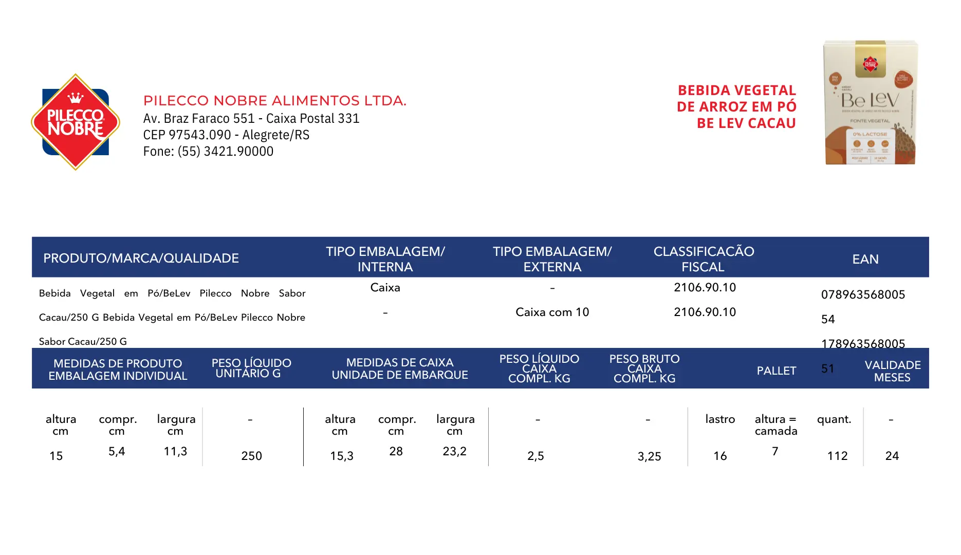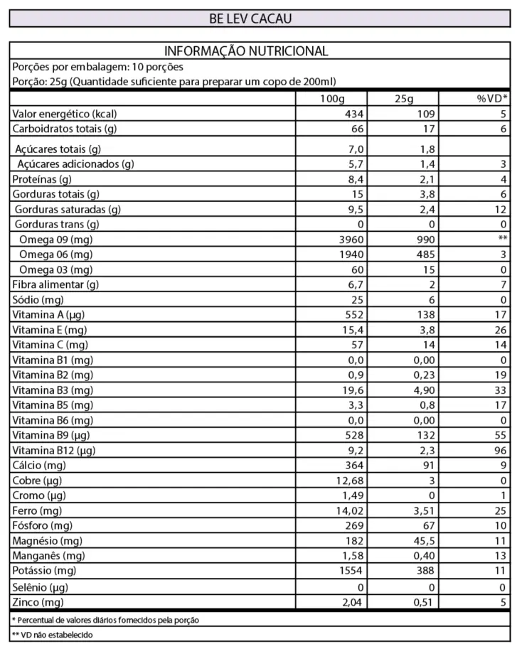 Superprática, versátil e nutritiva, Be Lev Pilecco Nobre sabor Cacau 100% é uma bebida funcional, de cor marrom-avermelhada, com sabor semelhante ao chocolate ao leite, naturalmente sem glúten, sem colesterol, rica em vitaminas B3, B9 e B12. Uma opção leve, saborosa e saudável.