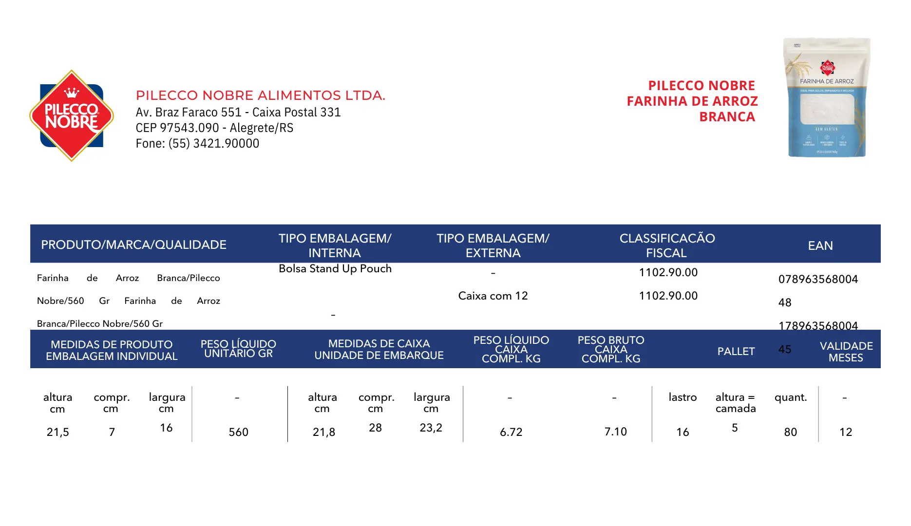 Produzida a partir de grãos nobres cultivados nos campos do Pampa Gaúcho, a Farinha de Arroz Pilecco Nobre é uma opção de alimento saudável e funcional indicado para celíacos, veganos e vegetarianos. Ideal para bolos, empanados e molhos, ela não contém glúten. É fonte de energia e absorve menos gordura que as farinhas tradicionais.