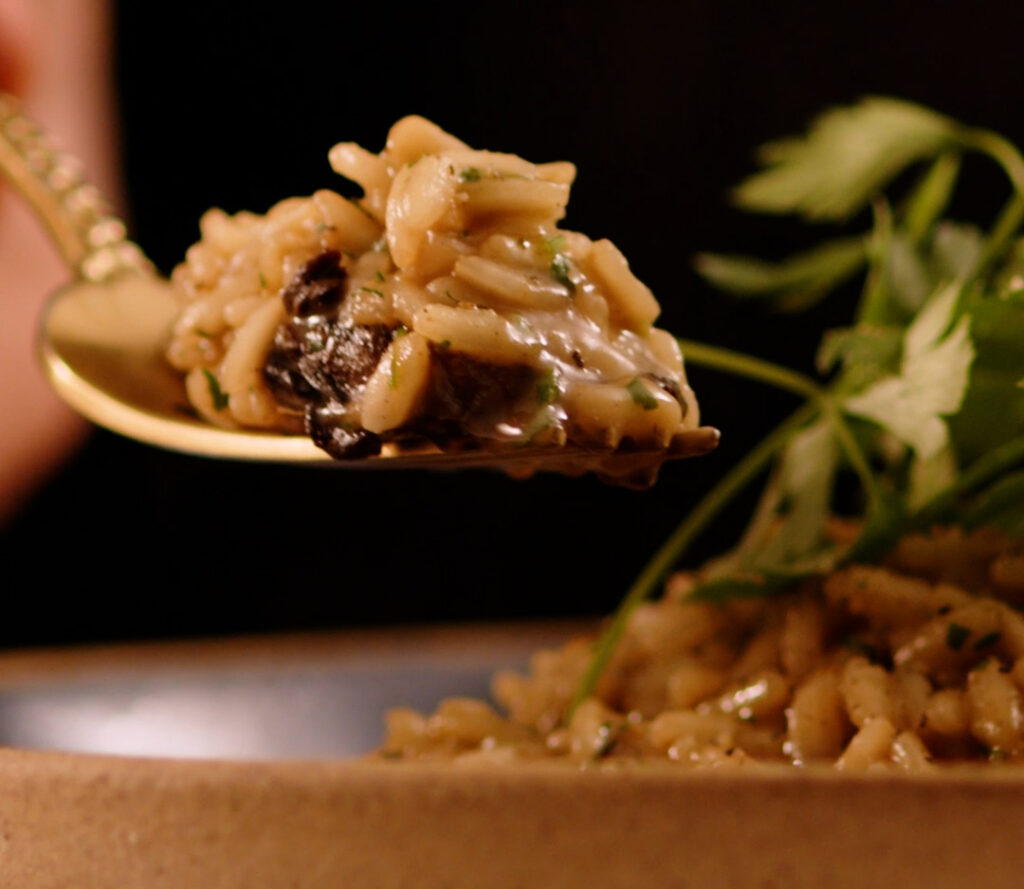 Risoto de filé, cogumelos-castanhos e alho-poró.