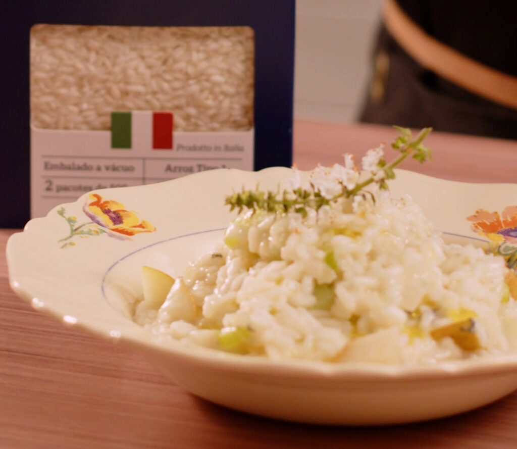 Risoto de pera, gorgonzola e aipo