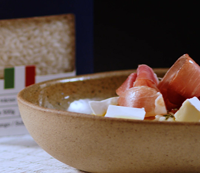 Risoto de presunto cru com melão e semente de abóbora
