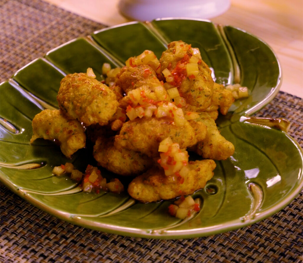 Bolinho de arroz com molho agridoce de pimenta e abacaxi