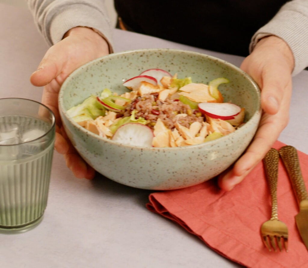 Salada com alface, rabanete, salmão e molho de limão, shoyu e azeite